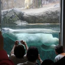 ガラス越しで間近に見るホッキョクグマのダイブは迫力です。