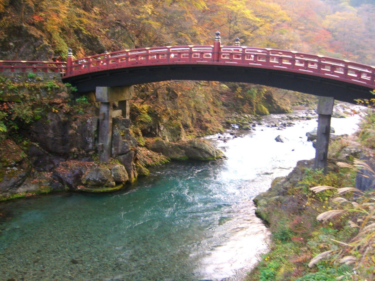 東照宮と二荒山神社への入り口に見える赤い橋です。日光駅方面や中禅寺湖方面の分岐点の信号、日光金谷ホテルの横にあり、土産物店も近くにあるので多くの人が写真を撮っています。アーチ形の木造橋で、日本三奇橋の一つです。