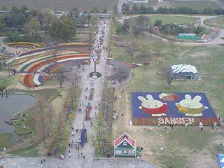 公園内に高さ65メートルの展望台があり登るのには600円必要ですが上からはチューリップとムスカリで作られたミッフィーの花絵が綺麗に見えました。
