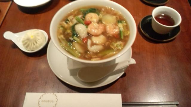 野菜、肉、海鮮の具がたっぷり入った、しょうゆベースのあんかけがかかったダールー麺というのがなかなか美味しかったです。 ミニサイズの肉まん(4種類から選べます)とこの麺料理のセットで1500円くらいです。 デザートのマンゴープリンもなかなかGoodでした!