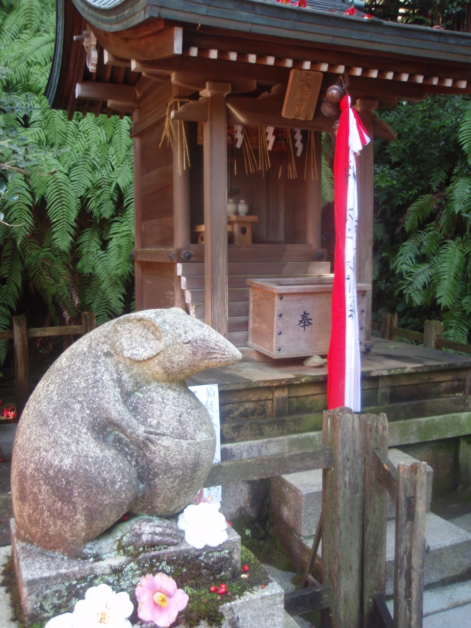 こじんまりした境内に幾つもの御社があります。椿の時期がきれいだそうですが、行った時はほぼ終わっていたのが残念。お稲荷さんを筆頭に日吉社には鬼門除けの狛猿、愛宕社には火伏せの狛鳶(とび)、大国主命を助けたとの言い伝えにより大国社に鎮座するのはかわいい狛ねずみ。健康、長寿、学問、縁結びにご利益があります。