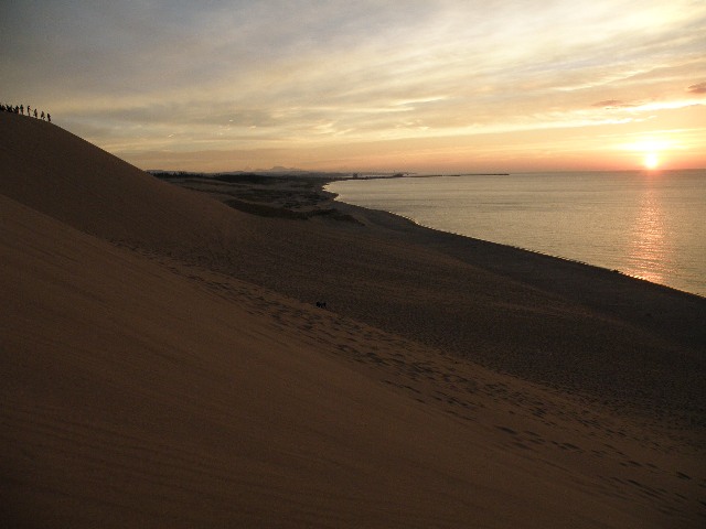 そんな砂丘の背から、海に沈む夕陽が見られます。何もない水平線に沈む夕陽に照らされた砂丘も良い感じです。