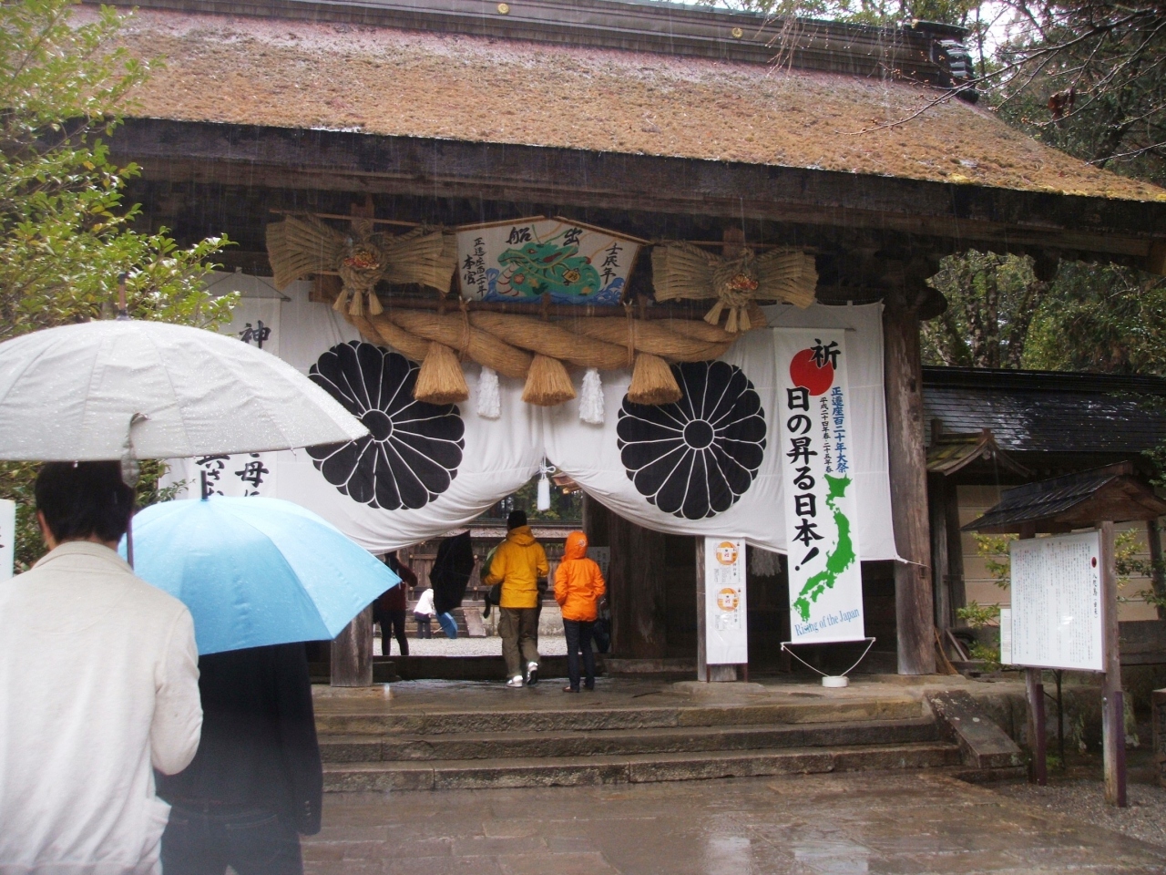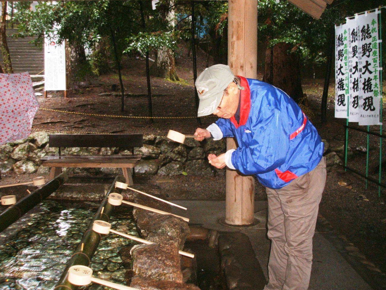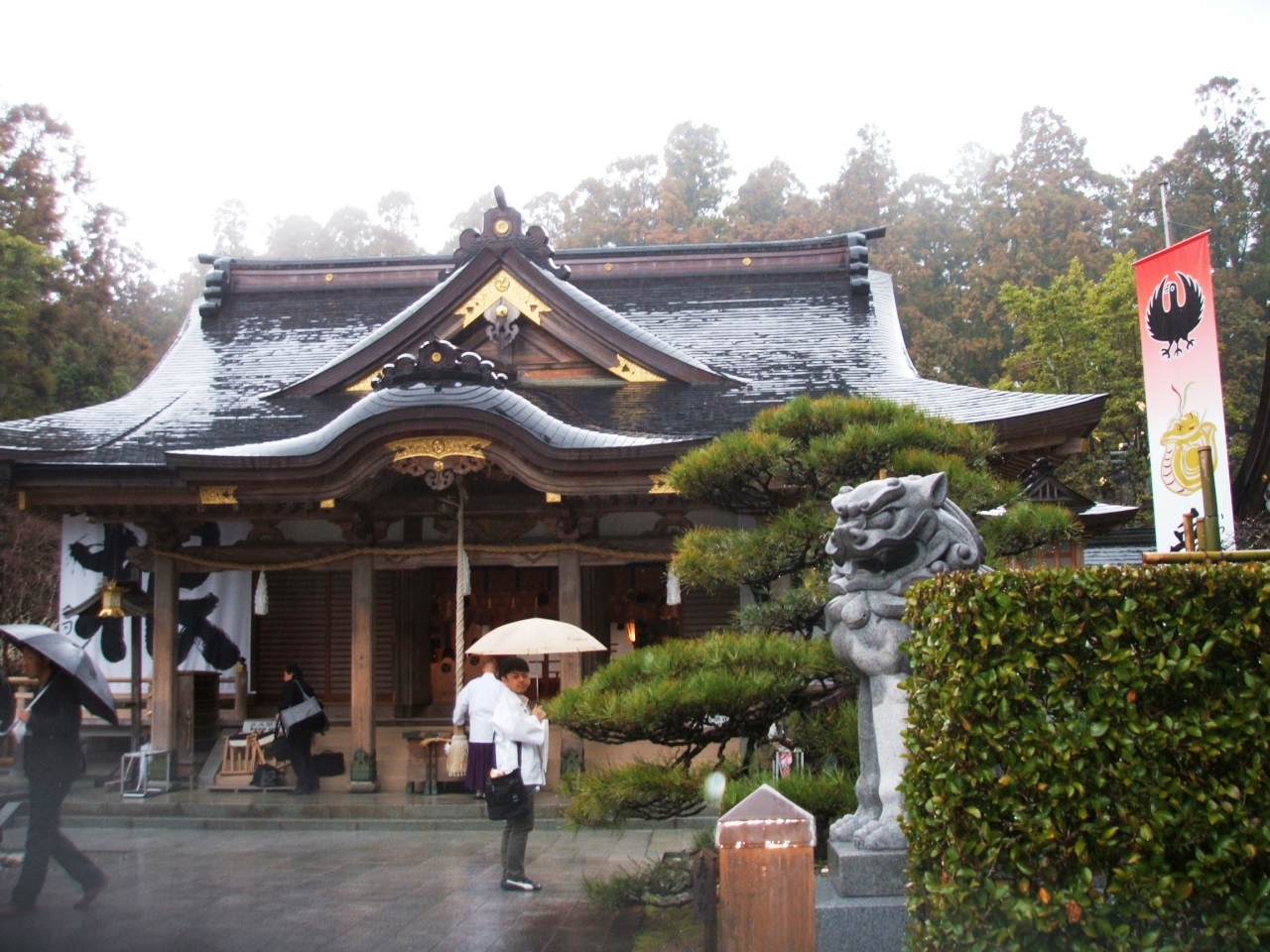 熊野本宮大社に参詣しました。熊野のシンボルマークにもなっている八咫烏の旗が見えてきました。八咫烏は、三本足の大きな烏だそうで、神武天皇を熊野から大和へと道案内したとされています。熊野三山ではカラスは神の使いとされて、信仰されています。日本サッカー協会のシンボルマークにも用いられていたので、目にしたことのある人は多いと思います。