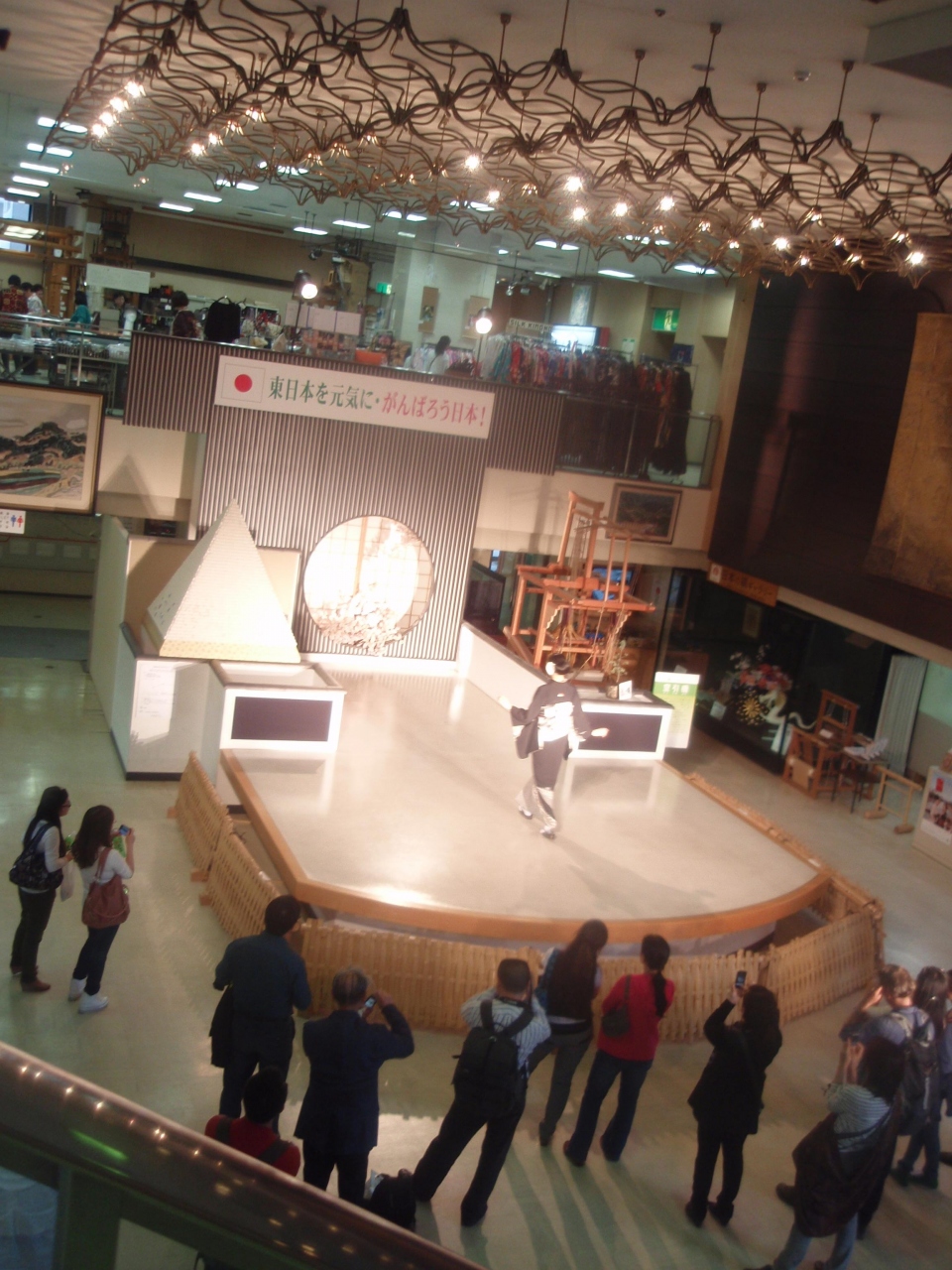 いわゆる観光客向けに西陣織をアピールするために作られた施設。1階は着物ショーが行われていました。事前に予約すればモデル体験もできるそう。有料できものや舞妓などの着付けもやってくれるみたいです。2階はいわゆるみやげものコーナー。ただ内装その他、かなり古い感じ。外国人ツアー客ぐらいじゃないとわざわざ行くことはないかなあ。3階は資料室になっているようでした。