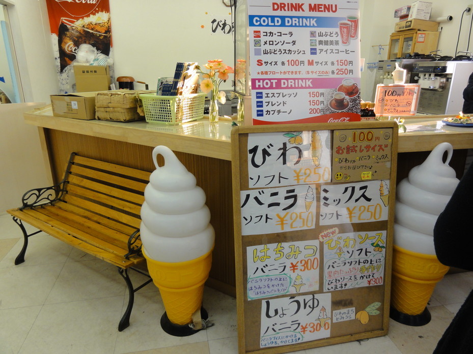 サービスサイズ¥100のびわソフトは2月に食べるのに丁度よい大きさで、食後も寒くなりませんでした。味もさっぱりしていてご当地ソフトとしてお薦めです。珍しいものでは、バニラアイスにかける醤油がありましたが味は?です。