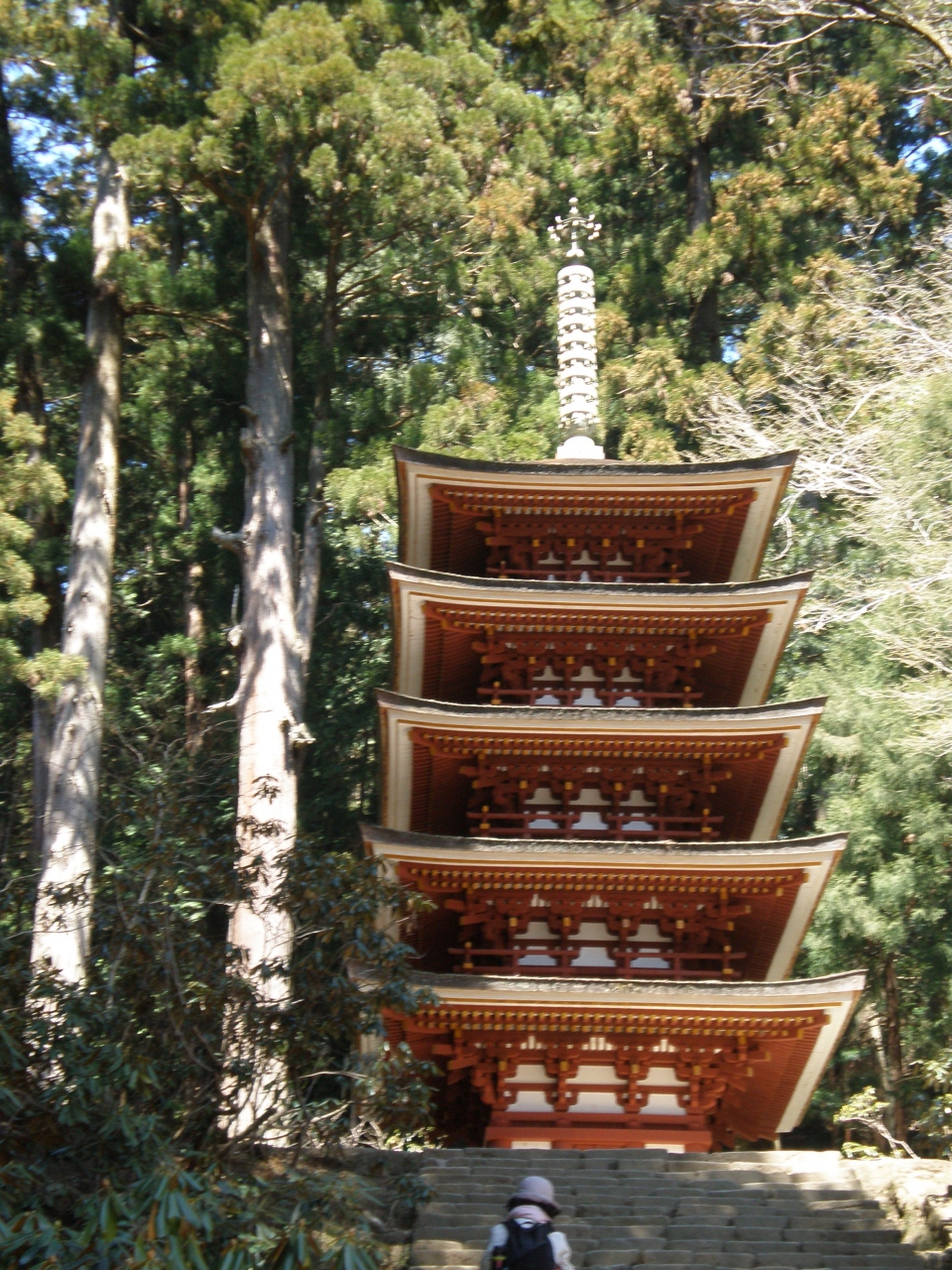 段差の高い階段は結構きつい。年代を感じる大きな木々が生い茂り、野鳥の声も聞こえてくる。台風で壊れた五重の塔は修復、12年に落慶した。