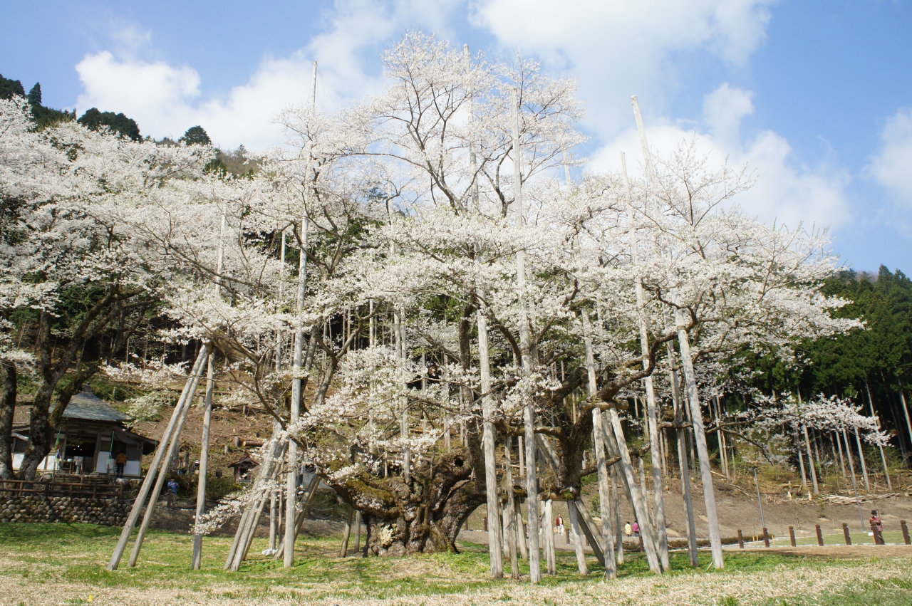 淡墨桜は日本三大桜の一つ。大垣市から、樽見鉄道で、終点の樽見駅下車。歩いて、15分くらい。根尾川という清流を渡った山の中腹にありました。その昔、継体天皇が幼少時代隠棲しており、天皇となるため都に旅立つ際に、植えていったという伝説や瀕死の状況から何度か再生したという宇野千代にまつわる話など、印象深い物語もあって、並みの桜ではないことが確かに感じられました。