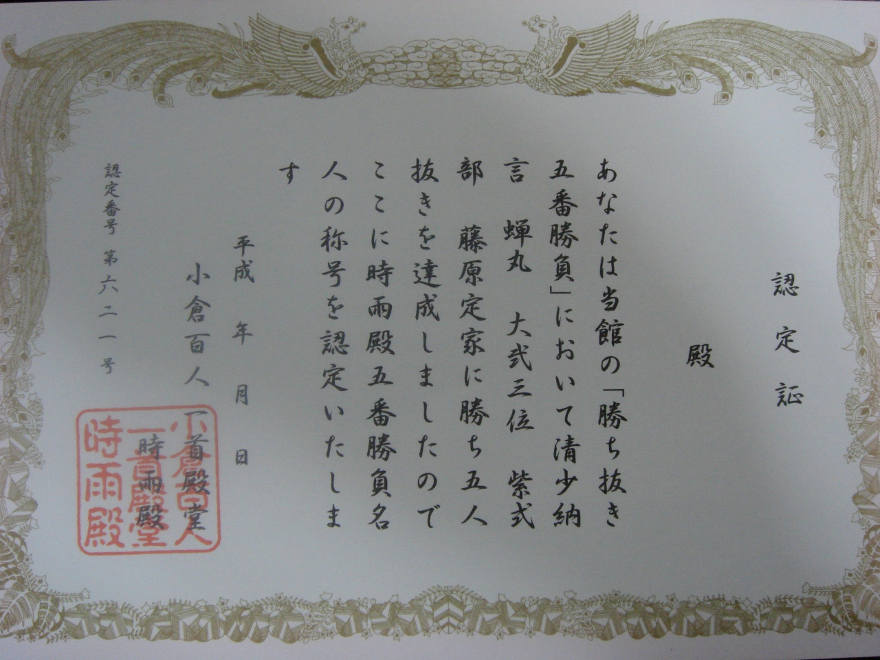 清少納言など歴史上の人物に扮した対戦相手を5人抜きすると賞状がもらえます