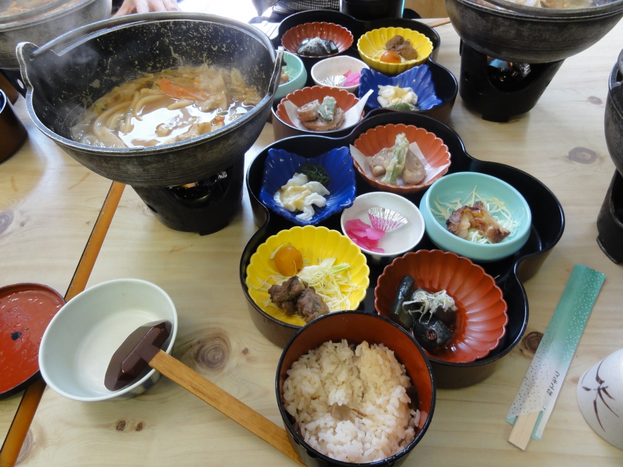 ツアーの昼食で山梨名物を頂きました。メニューはかぼちゃほうとう鍋(豚肉入り)、鳥もつ煮(きんかん入り)、レンコンの海老すり身揚げ、揚げ茄子の南蛮漬け、炙りチキン、湯葉こんにやく、松茸ご飯でした。鳥もつ煮はB級グルメグランプリの一品でキンカンが卵のように思えました。ほうとうも美味しかったです。