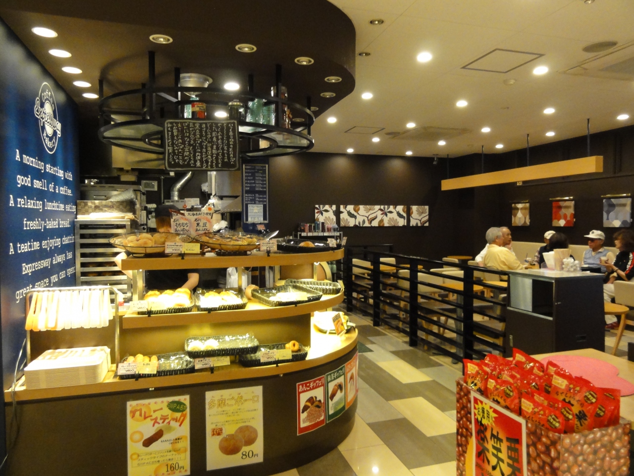 お洒落な喫茶コーナーがあり、団体じゃなかったら入ってみたかったです。牛丼の吉野家もありました。ゆふいん発プリンどら焼き等商品一杯のファミリーマート、外にはくまさんカステラやクレープのお店とゆっくり見たい、食べたいお店がギュッと詰まったSAです。