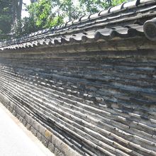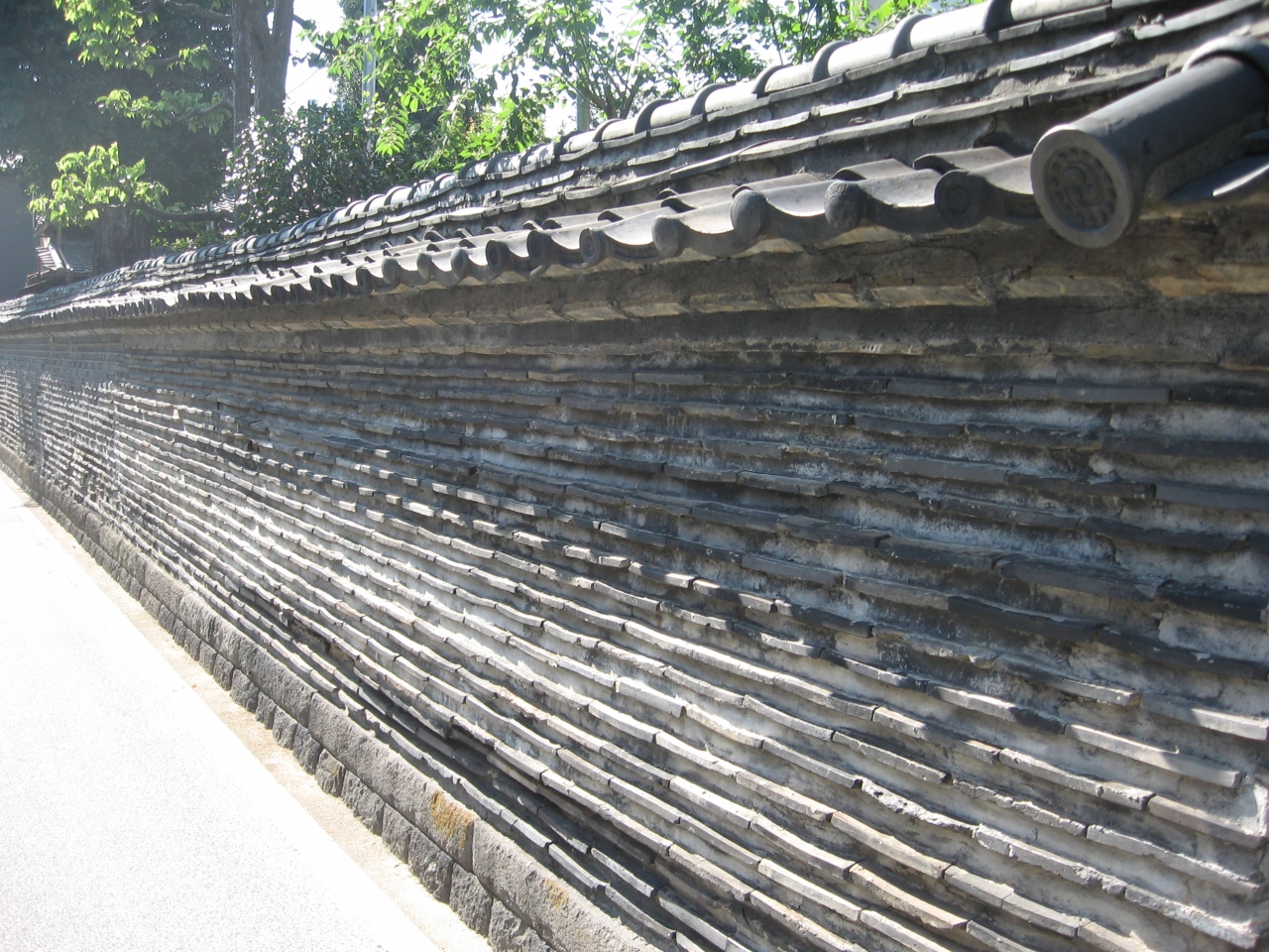 瓦と土を交互に積み重ねて作った土塀に屋根瓦を葺いためずらしい塀で下町の情緒がにじみ出ている感じである。