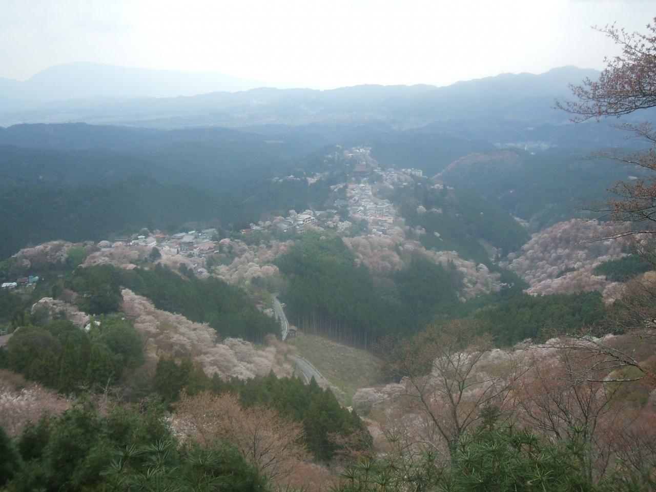 ロープウェイの駅からえっちらおっちら花矢倉に到着すると桜のシーズンだけあってたくさんの人であった。雨がぽつぽつ降っていたのでここで弁当を食べるのは断念した。でもここから見る桜はとても絶景ではあったが道路などが見えたりして雰囲気を少し壊している。一番のベストスポット、一目千本には負けた感じがする。