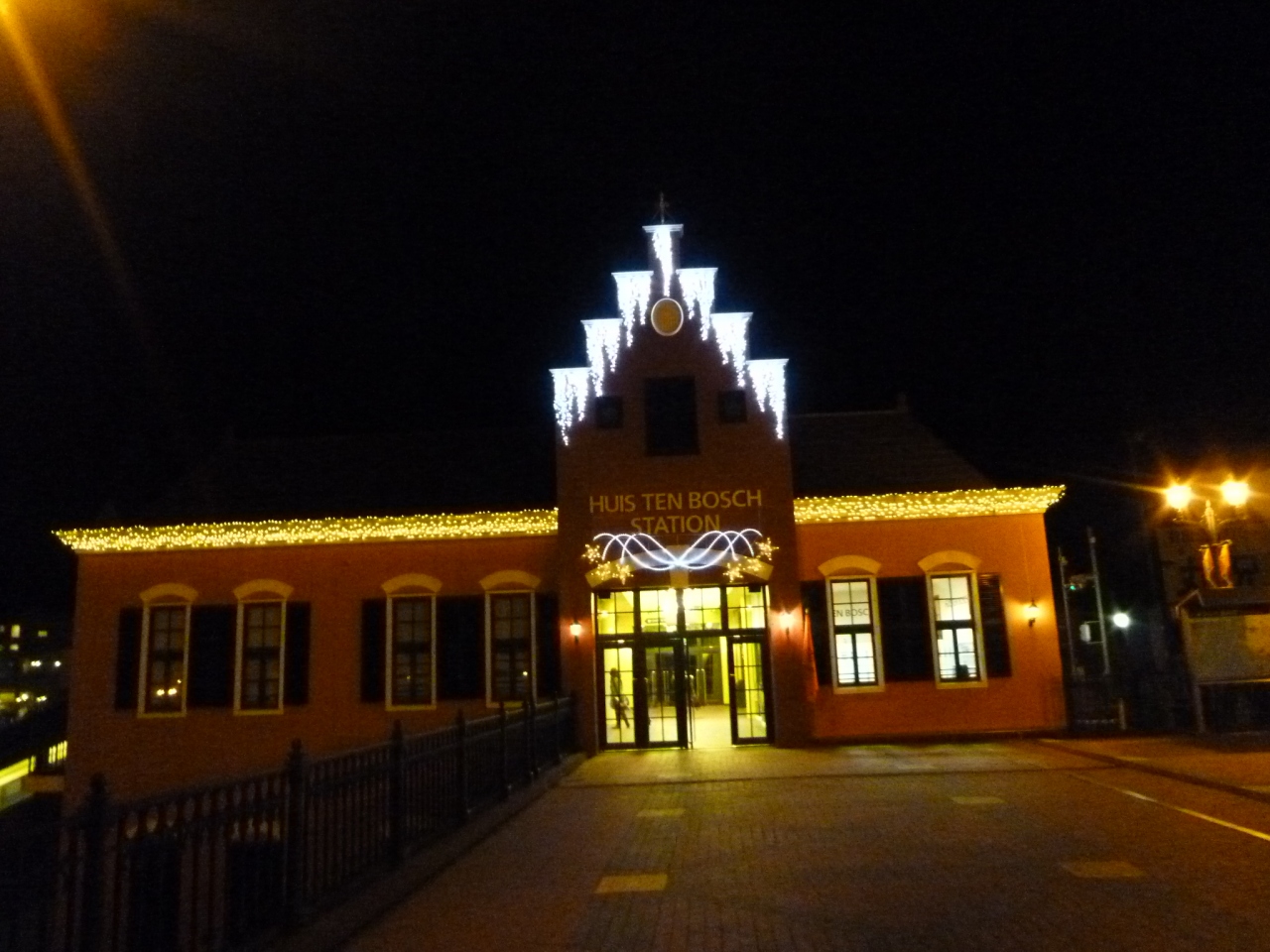 夜、電車を待ってベンチに座っていると、目の前にあるハウステンボスの夜景がきれいに見えます。