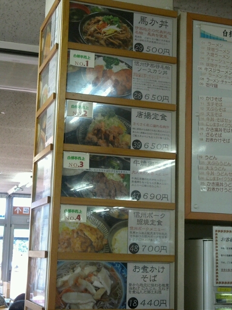 食堂は、ソースカツ丼、信州ポーク、馬肉丼などご当地グルメのメニューが豊富でした。