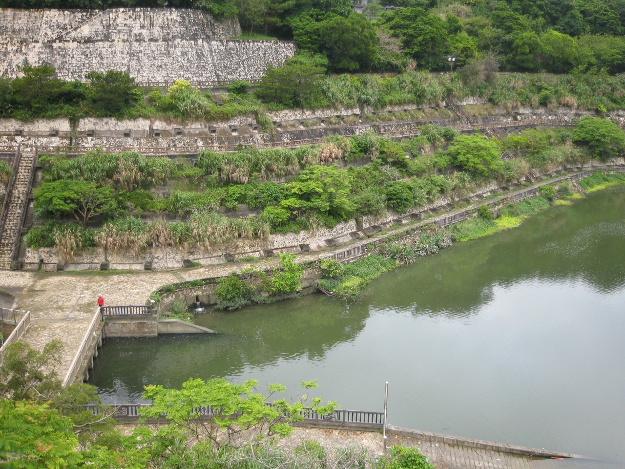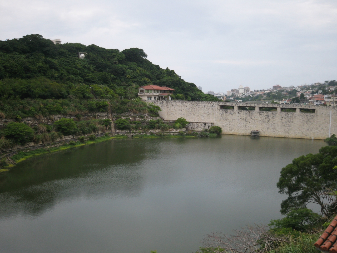 金城ダムは首里金城町にあり、金城町の石畳の入り口から徒歩2分くらいでたどり着きます。首里城と識名園を結ぶ位置にあることから、水と緑と石造りをテーマとして周辺整備が行われたそうだ。実際、緑が多く遊歩道、休憩施設があり市民の憩いの場となっているようで市民が散歩している姿がみられた。ピクニックでも出来そうなダムである。