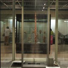 さきたま史跡の博物館は、国指定史跡「埼玉古墳群」から出土した遺品を中心に展示されている博物館。写真は、国宝展示室にある「国宝金錯銘鉄剣(こくほうきんさくめいてつけん)」。剣は鉄で、ボロボロに錆びていますが、剣に刻まれた115の黄金の文字はくっきりと残っていまして、鮮やかです。これは、5世紀末の古代国家成立のなぞを解くための超一級資料。100年に一度の大発見です。その他、稲荷山古墳から出土したヒスイの勾玉や鏡などの副葬品。将軍山古墳から出土した馬につける鉄のカブト、馬冑(ばちゅう)も珍しいもの。なお、将軍山古墳には、別館として、石室の内部が見学できる将軍山古墳展示館もあります。