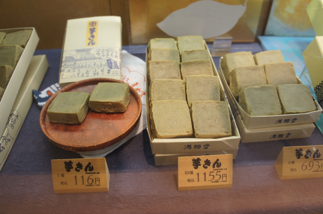 満願堂本店は浅草です。写真の芋きんがここの名物。薄い皮に包まれたサツマイモの御菓子です。中の芋がめちゃめちゃうまい。焼き芋で、べちょっとして汁気のある場所がありますよね。あるいは、干し芋で柔らかい場所がありますよね。一番おいしい場所です。そのおいしい場所だけを集めて、四角い御菓子に詰め込んだような感じです。自然のおいしさが職人技で高められてはいるのですが、基本は芋のおいしさが御菓子のおいしさになっているので、飽きもこないでしょう。夏場限定で、ゼリーっぽいのもありましたが、こっちも絶品です。