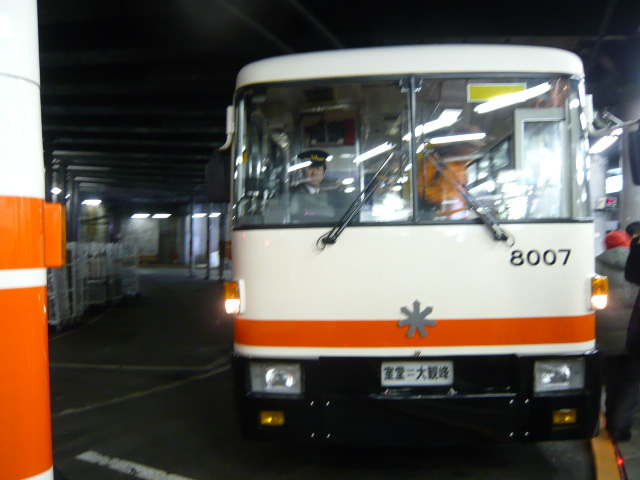 車体はごく普通の路線バスで、乗客が多い場合は座席に座れない可能性があります。トンネル内のため、車窓からの景色は真っ暗で、破砕帯の近くのみライトアップされていました。