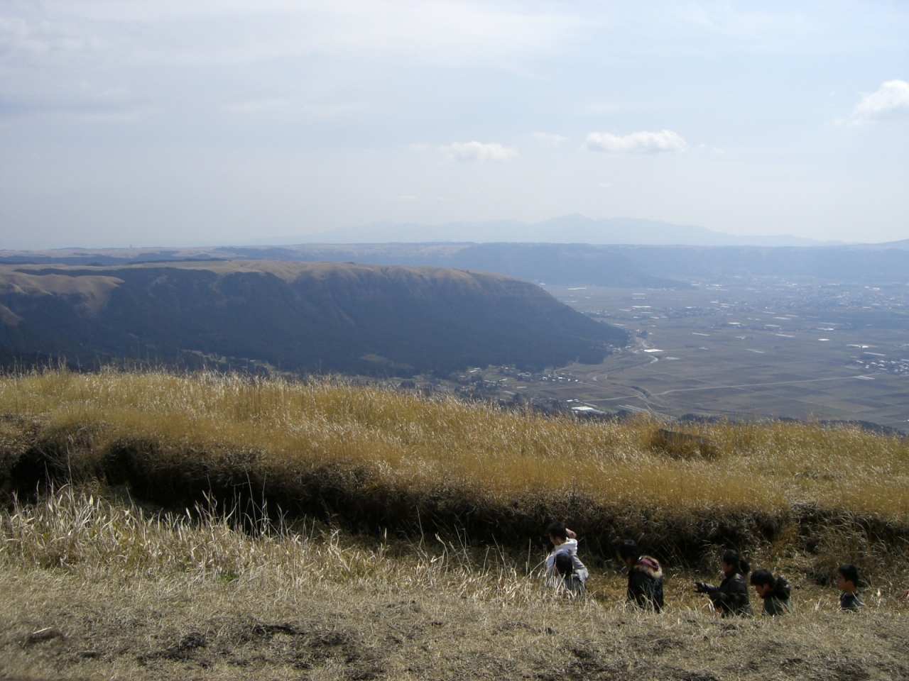 阿蘇の山々を一望することができる絶景ビューです。眼下にはカルデラに敷き詰められた感じの田んぼや畑や民家を見ることができます。