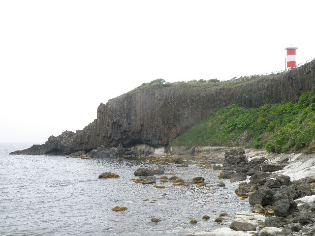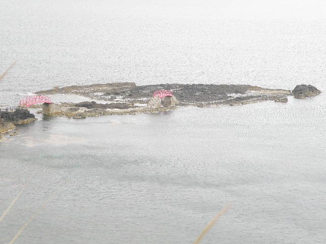駐車場に車を置いて、紅白の灯台のそばへ。さらには、波打ち際まで下りていくことができます。岩場をつなぐ赤い橋が二つ。ちょっとかわいいです。