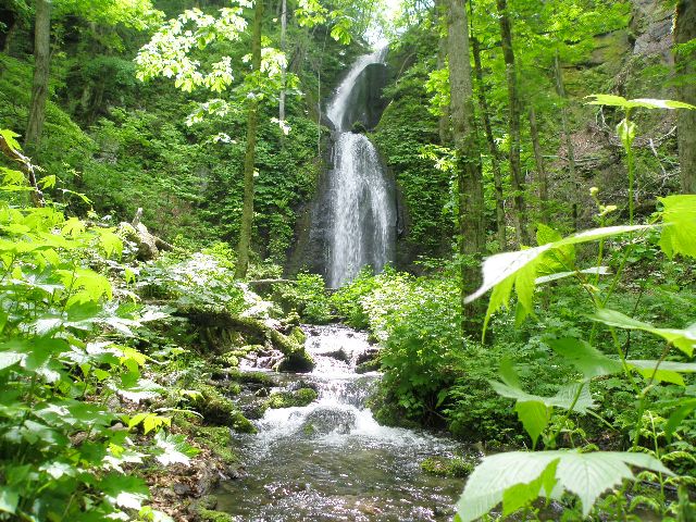 上の方から落ちてくる滝の水しぶきで虹ができることもあります。新緑の中を落ちてくる滝の水は、小さな川の流れとなって、奥入瀬川に合流します。