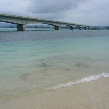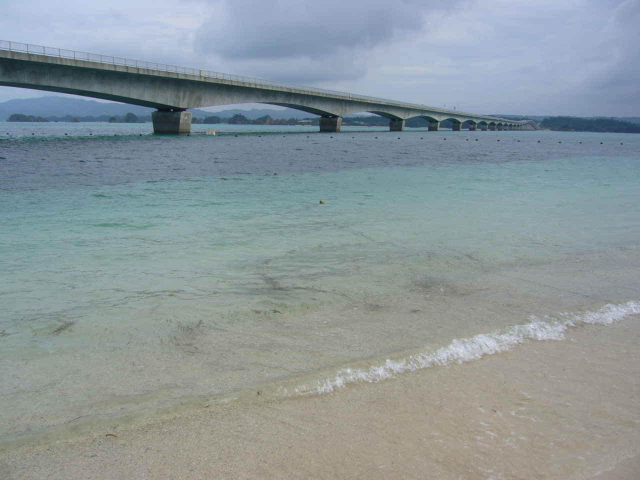 晴れていると、両側にエメラルドグリーンの海がどこまでも広がる。古宇利島と屋我地島を結ぶ全長1960メートルの橋。驚くほど澄んだブルーをたたえた海の上をまっすぐ延びる橋は格好のドライブルートです。でも橋の上は駐停車禁止なので、橋のたもとの駐車場に止めなければならない。