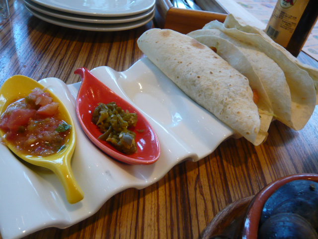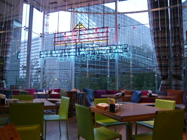 TOKIAの2階にあるメキシコ料理のお店で、天井が高くゆったりしてました。入口近くにはバーカウンターがあり背の高い椅子やテーブルが並んでいてバーのような雰囲気ですが、窓際席は円形のソファ席があり、子供連れの団体さんがいました。