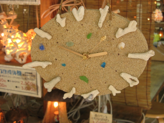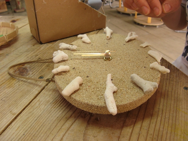 また、お気楽な工作として、サンゴとシーグラスで時計を作った。