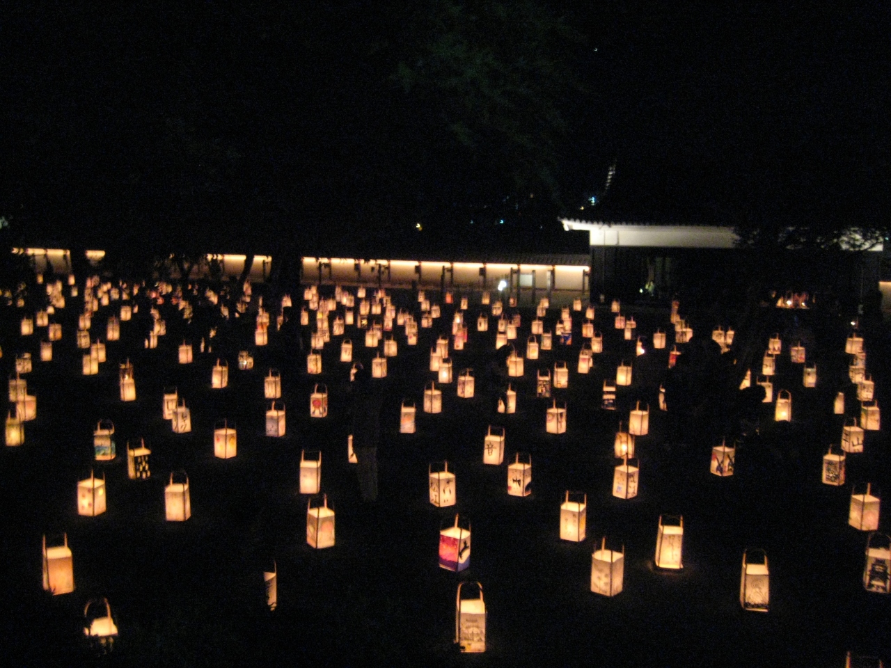 山陰への気ままな旅の途中、松江市で夜を迎えました。宍道湖で夕日を眺め、何か美味しいものをと松江城の方向へ向かうと、浴衣を着た若いお嬢さん達が大勢連れ立ってお城の方向へと歩いて行きます。これは何かあると思い、後ろを歩いて行きますと、「松江水燈路手作り行灯展」なるお祭りが開催されていました。松江城内とその周囲の堀に沿って何百もの市民手作りの行灯が夜の闇を静かに灯らしだしていました。その幻想的な光景は私の胸に染み渡るような静かな感慨をもたらせてくれました。
