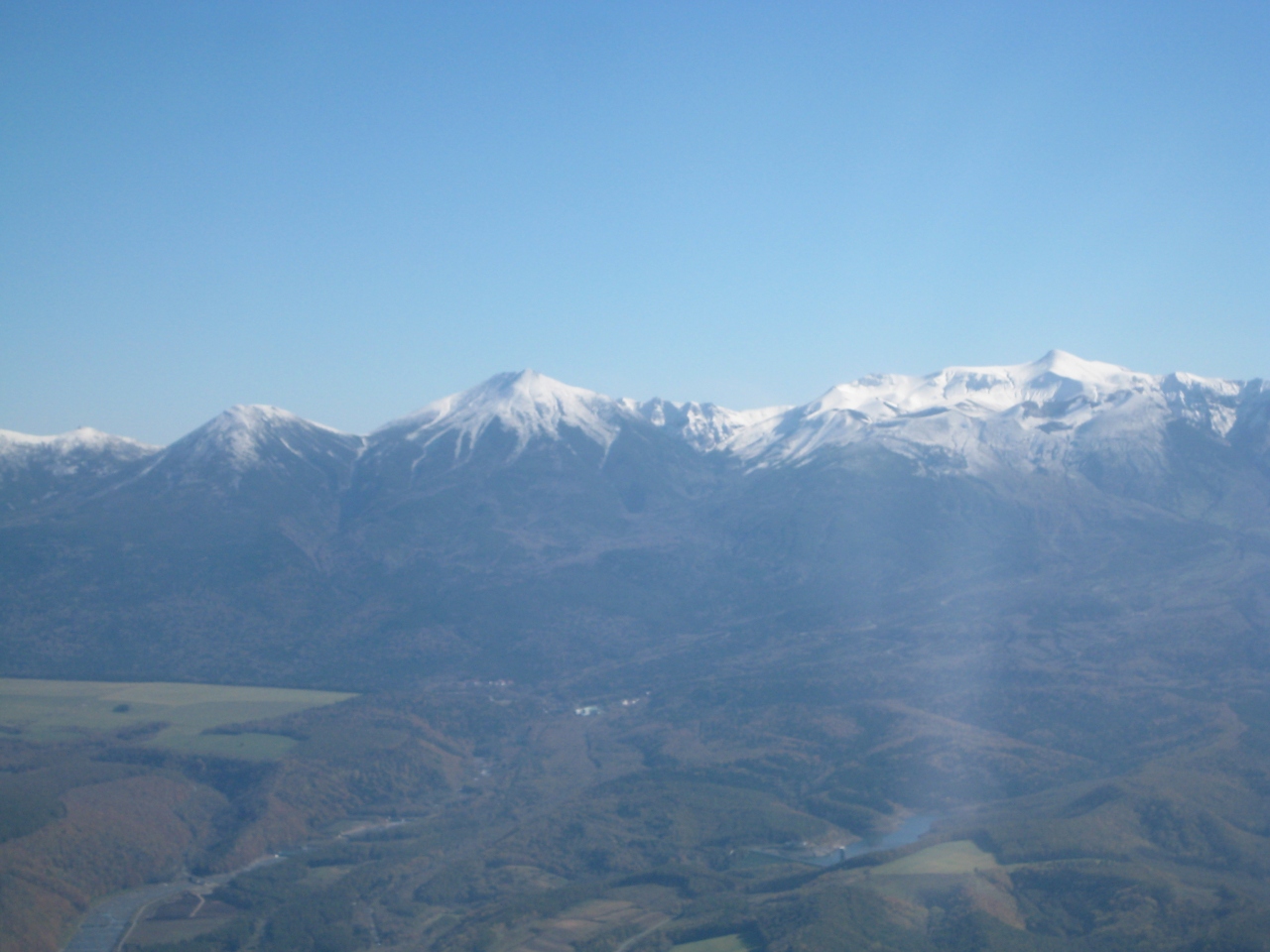 飛行機で旭川空港へ向かうと十勝岳と十勝岳連峰が見えます