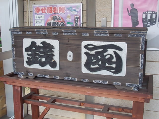 この駅は、その名前から商売繁盛や宝くじの高額当選など、金運上昇を願う人々にとっては聖地的な位置付けの駅として知られています。実際駅では、近くの豊足神社で祈願されたという開運入場券などが販売されていますし、ここの駅スタンプは金運上昇のご利益があると云われておりますので、是非押印していって下さい。尚、渋い見所として、豊足神社の本殿脇には、明治40年に近くの海岸で発見されたという、ロシア製機雷の残骸が展示されていますので、お時間があれば、こちらも是非見に行ってみて下さい。駅からは徒歩5分程度です。