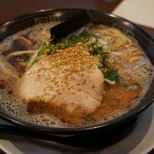 久留米ラーメンでググッたところhitしたお店です。11時30分頃到着すると、お店の前にはすでに行列が...。駐車場も一杯で、近くにある臨時駐車場に車をとめました。黒とんこつラーメンをオーダーし、一口目の感想は「おいしい!」ですが、食べ進むうちに、とんこつ特有のぎとぎとが口に残る感じで、くどく思えてきました。お水の代わりに冷緑茶が置いてあり、これを飲みながら食べると口の中がさっぱりします。