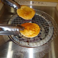 しょうゆ工場の見学を楽しんだ後に、同じ館内にある小さなレストラン?の中で、しょうゆせんべいを焼く体験が出来ます(有料)。味のついていないせんべいのもとをテーブル脇にある作り方を見ながら焼いて、両面にしょうゆを塗って。焼き立てはとっても美味しいです!