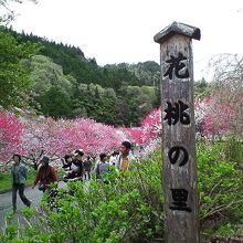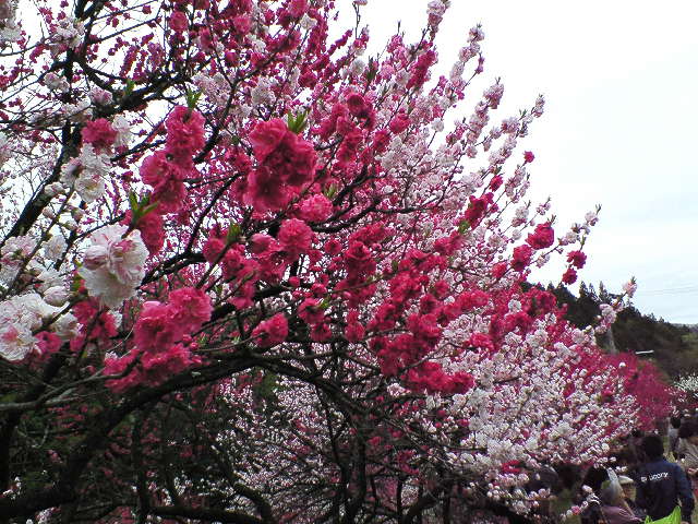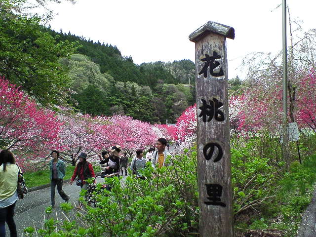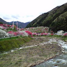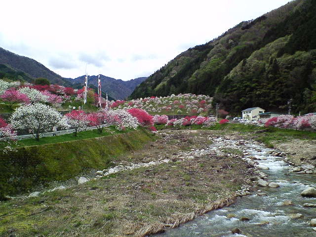 園原?Cからすぐの阿智村「花桃の里」です。到着までの道中も近づくにつれ、あちらこちらに花桃の木が見え、期待も大きくなります。1本の木に赤・白・ピンクの花が咲き、華やかでなんとも美しい。期待に違わず、誰もが思わず「きれいー」って声に出すような感じでした。