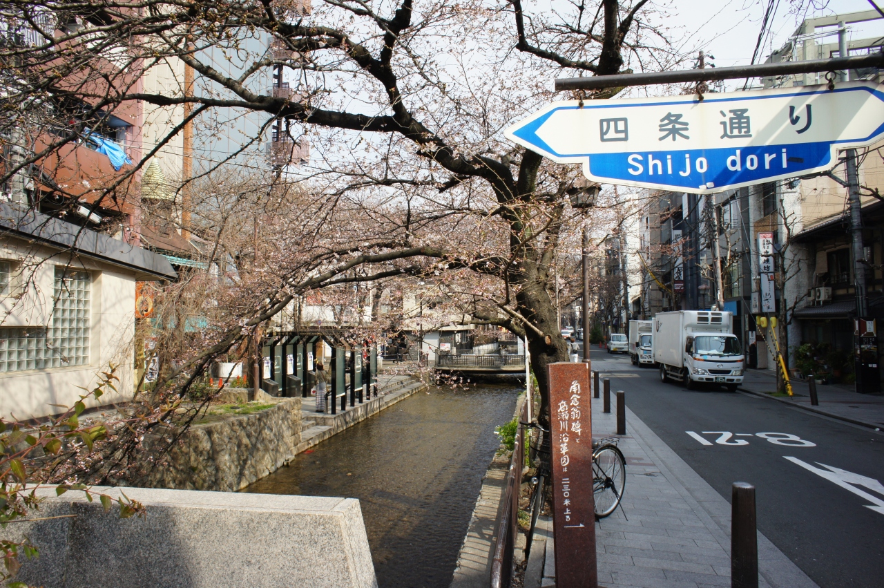 高瀬川は、江戸時代の初期、角倉了以、素庵父子によって、京都の中心部と伏見を結ぶ物流のために開かれた運河。その後、大正期まで約300年の間、京都と伏見の水運に使われました。写真は、阪急河原町駅から出てすぐのところ。水面にせり出して伸びる桜の枝が風情たっぷり。同じように小川と桜の組み合わせだと、京都市内では祇園白川の桜の方が有名でしょうが、こちらもけっこういいです。桜の終盤の頃は、さらさら流れる川面にたくさんの桜の花びらが浮いていて、すごくきれいです。