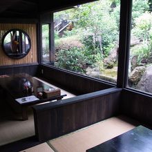 - さまざまなお部屋があり、滝や古民家の屋根などが見えます。