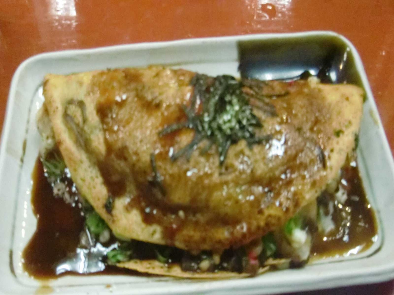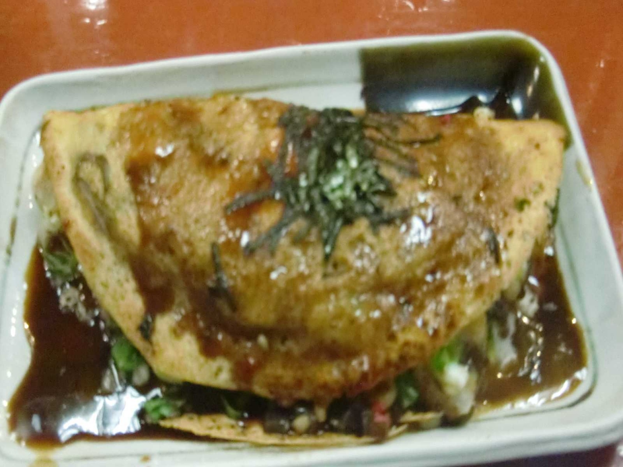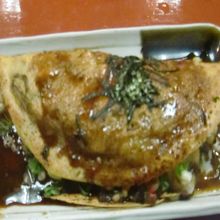 鹹めなソースで味を付け、刻みのりがふりかかっています。