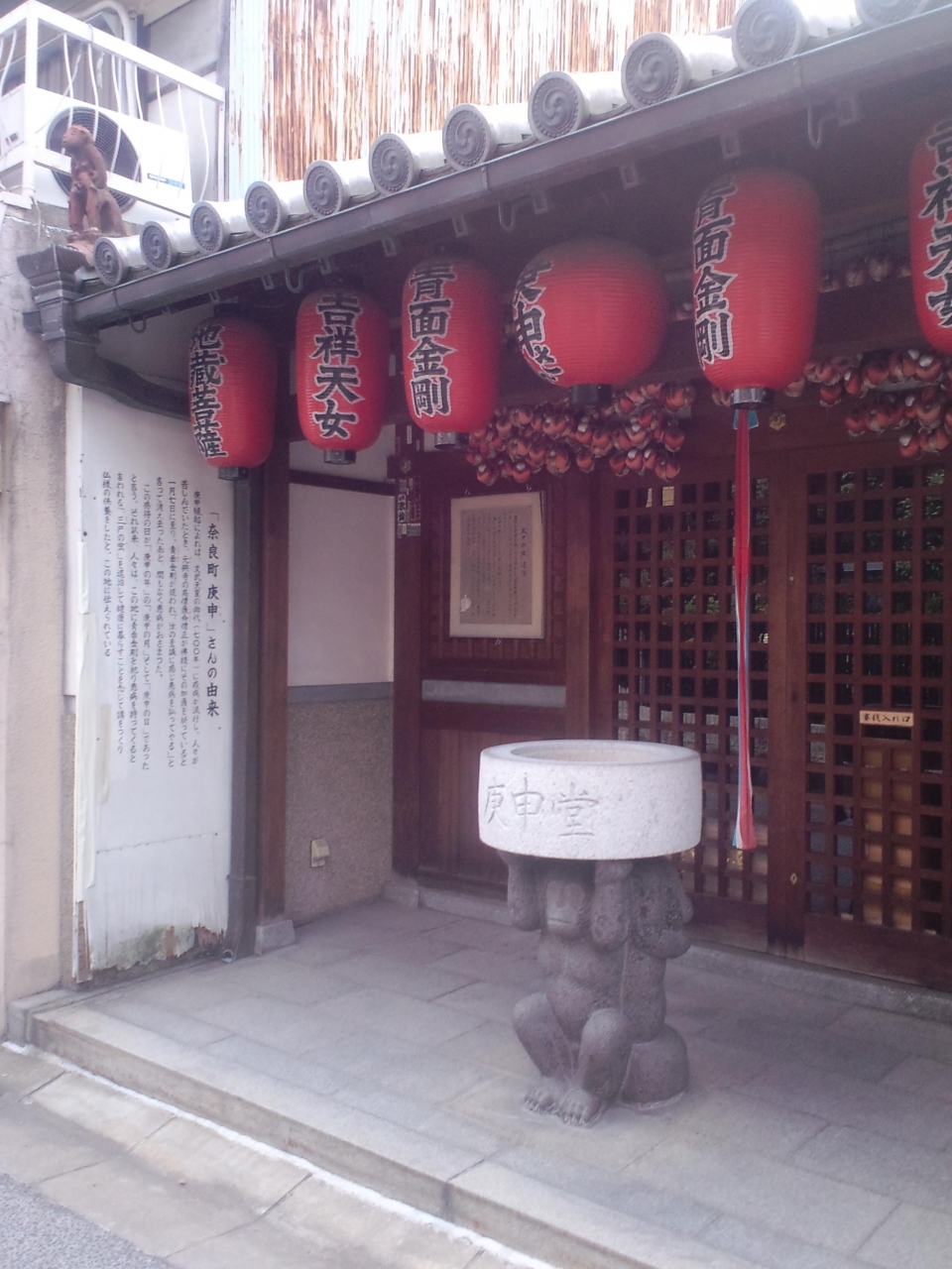 身代わり猿の庚申さんで有名ですが、こんなに小さい祠とは意外でした。青面金剛の使いの猿があの「庚申さん」。奈良町の案内所などで買うことができます。大小で大人と子供。背中に願い事を書いてつるせば願いがかない、災の身代わりになってくれるそうです。
