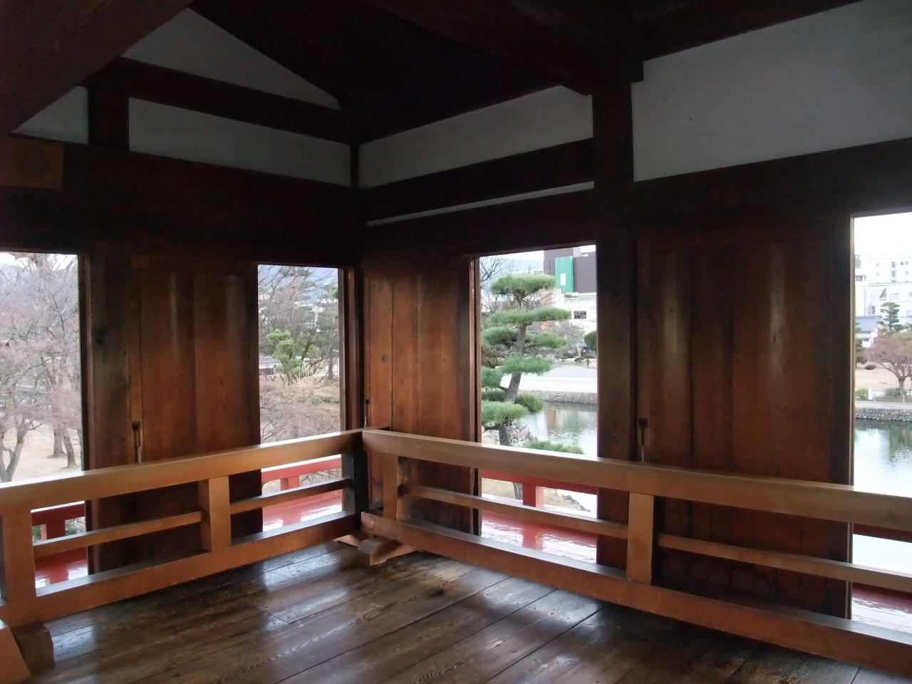 松本城天守閣に登ると、展望は抜群で松本の町の先には、雪を頂いた北アルプスも見えます。