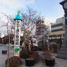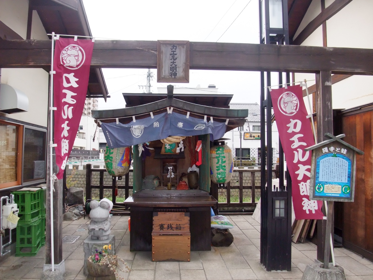 カエルはこのナワテ通り商店街のシンボルです。かつて、ナワテ通り商店街の横を流れる女鳥羽川には、河鹿蛙が住んでおり、いい声で鳴いていたそうです。ところが、川が汚れるにつけ、河鹿蛙はいなくなったのだそうです。その後、蛙の住める美しい景観を取り戻そうと願い、この町を蛙の町としたのだそうです。