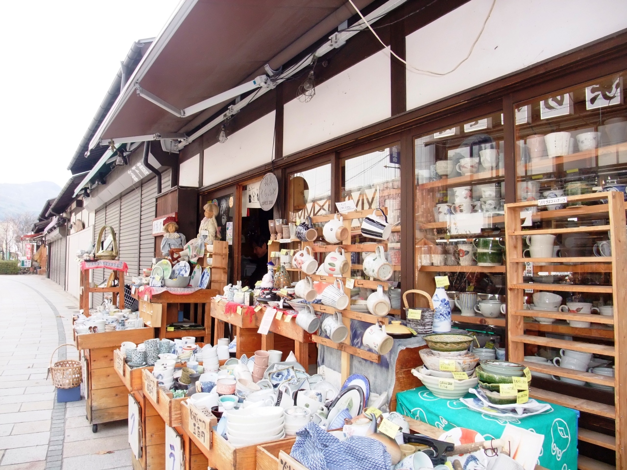 なわて通り商店街は歩行者天国です。女鳥羽川岸にずらりと並ぶナワテ通り商店街の家並。味があります。