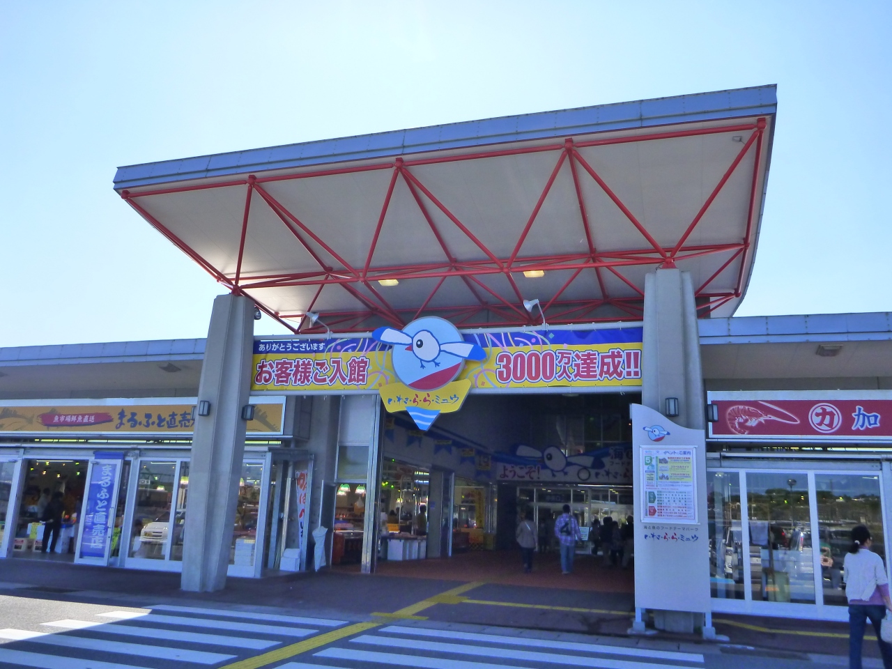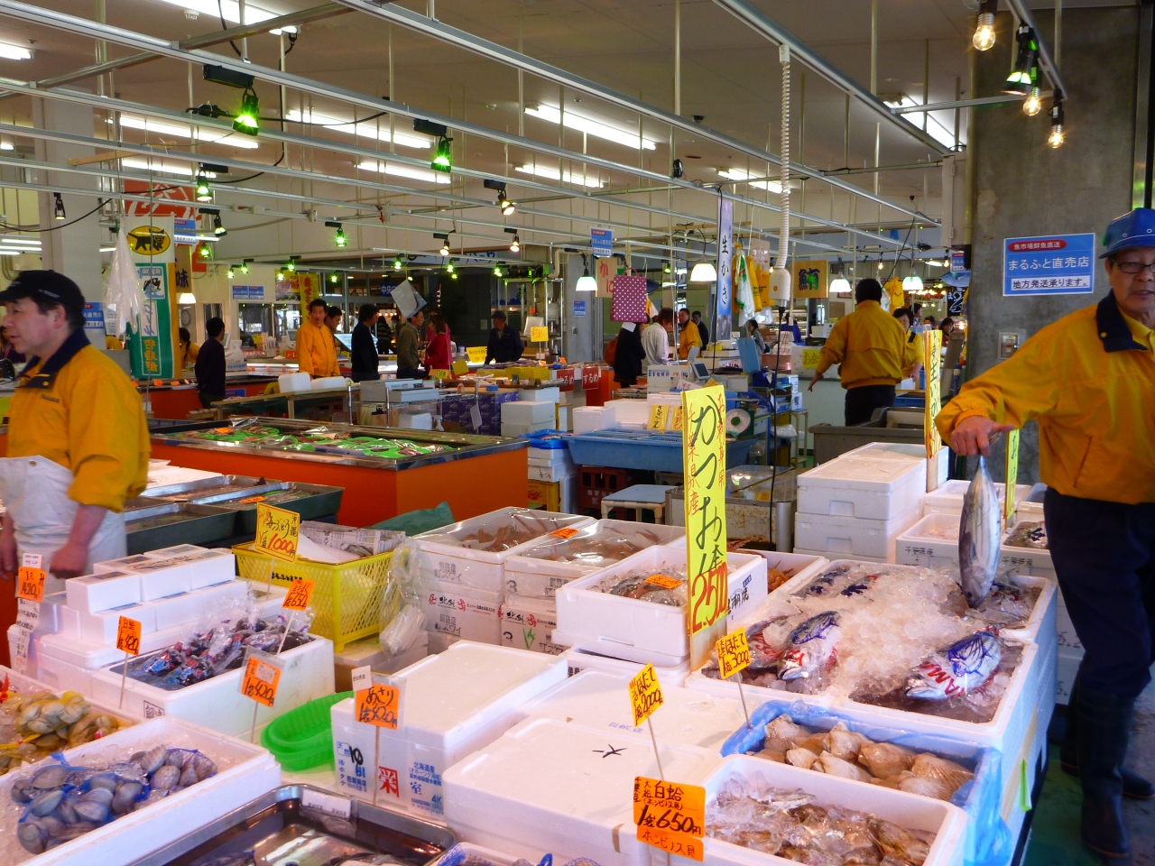 元々は主に観光客を相手にした、小名浜の漁港であがった地物海産物を販売する市場だったのですが、現在福島県の漁港は漁の自粛をしているため、主に他県から海産物を取り寄せて市場を開いています。アクアマリンふくしまに隣接する場所にあり、セット観光が多いためこの日も数台の大型観光バスが停まっていて、市場自体は客も多かったです。