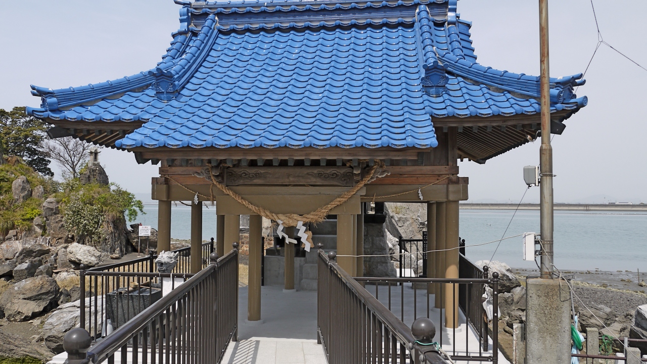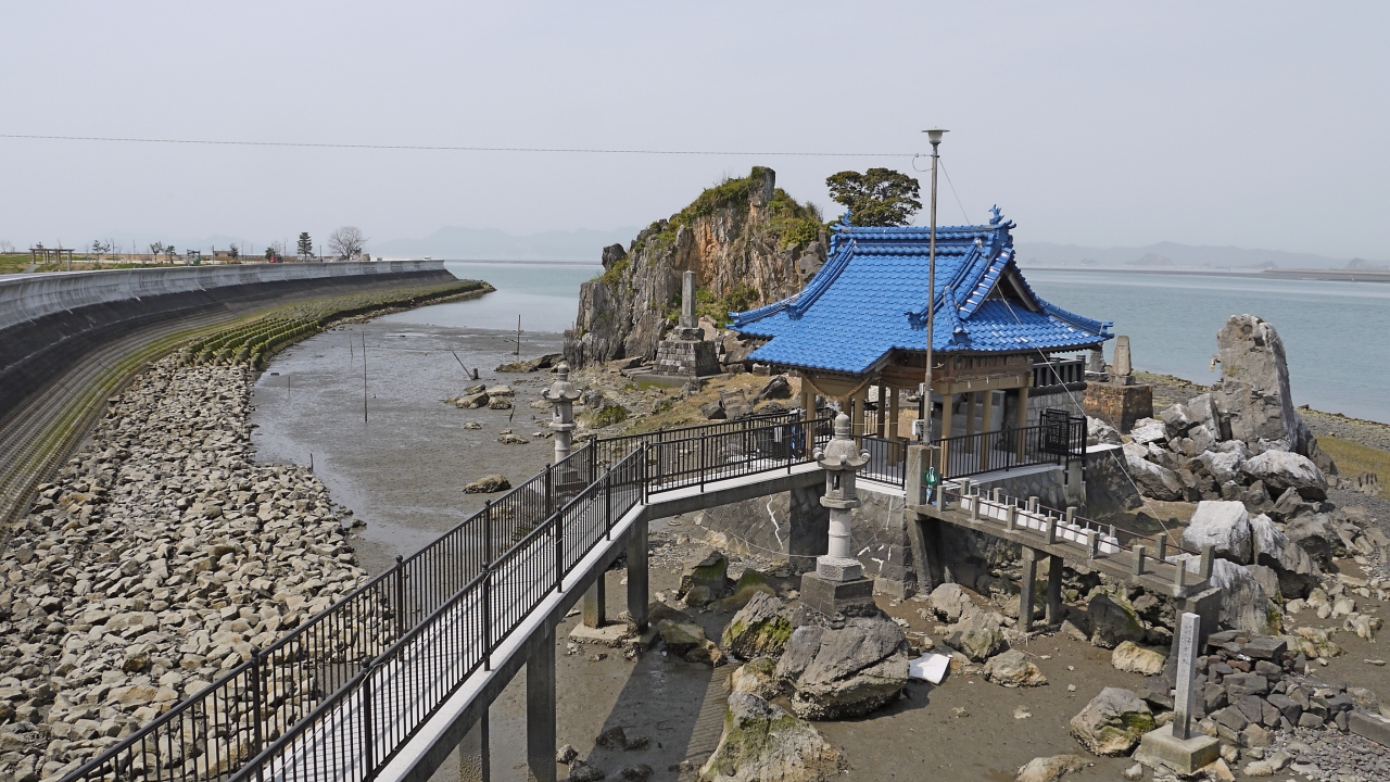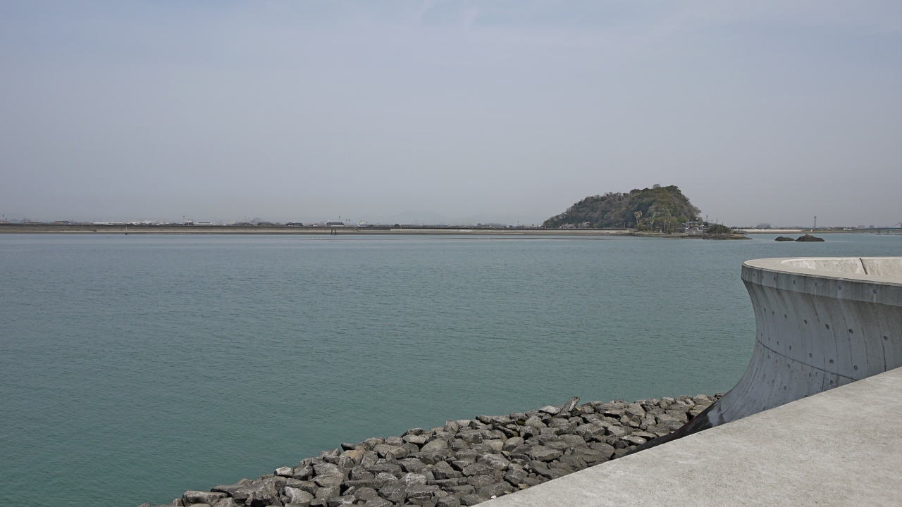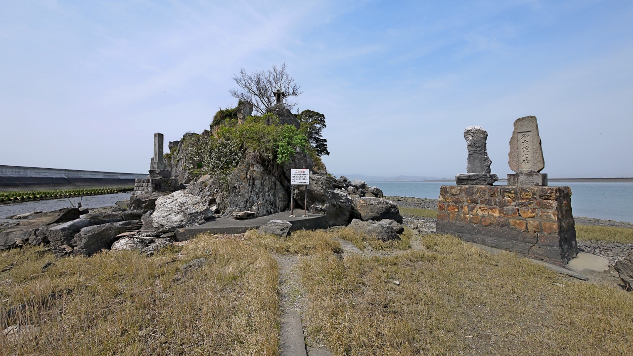 万葉集では長田王により「聞きし如まこと貴く奇しくも神さび居るかこれの水島(人の言うように、貴く不思議にも神々しく見えることよこの島は)」と歌われています。」という由緒正しき島(http://www.city.yatsushiro.kumamoto.jp/ar/article_view.phtml?id=12278),しかし防潮堤の外にポツンとある.古の景観を想像するに楽しいが,もうすこし保存が行き届いていたらよかったと思う.熊本南部が天皇の勢力に入っていった過程を表す場所として素晴らしいのだが...