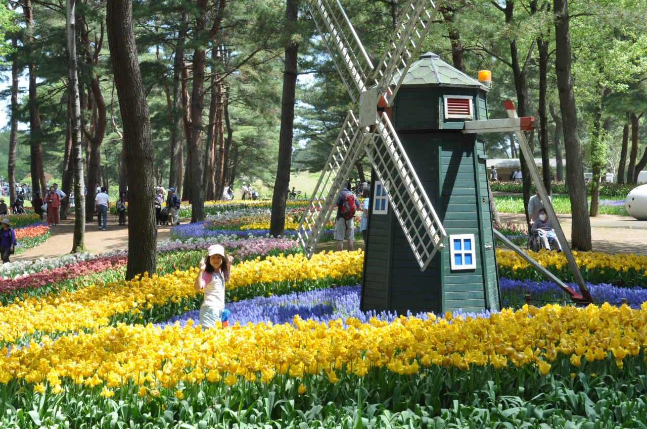 春には約1haの敷地に100万本のスイセンから始まり、チュウリップ