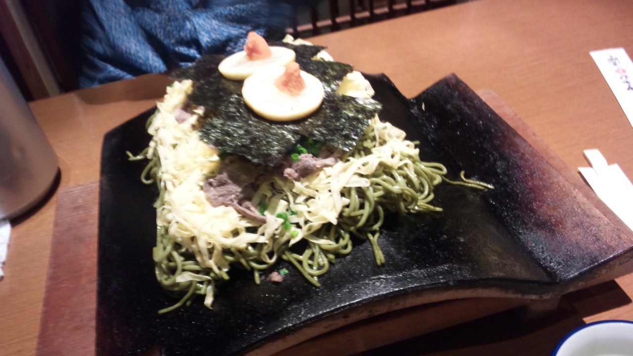 瓦そばといえばこの形。本物の瓦の上に茶そばが乗っていて牛肉やネギ、卵などがたっぷりとのっています。カリカリした部分もおいしい!