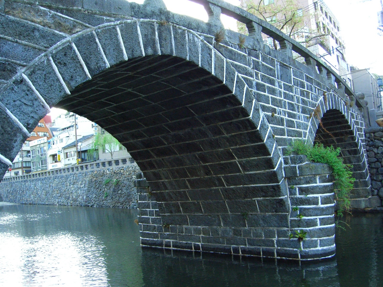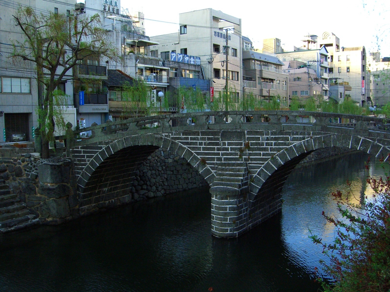 長崎市の中島川に架かる石造二連アーチ橋で、水面に写る橋と合わせると眼鏡のように見えます。橋を通過する中島川の辺まで降りることが出来、鯉がたくさんいました。長崎くんちで有名な諏訪神社でお参りして路面電車で戻ってきました。