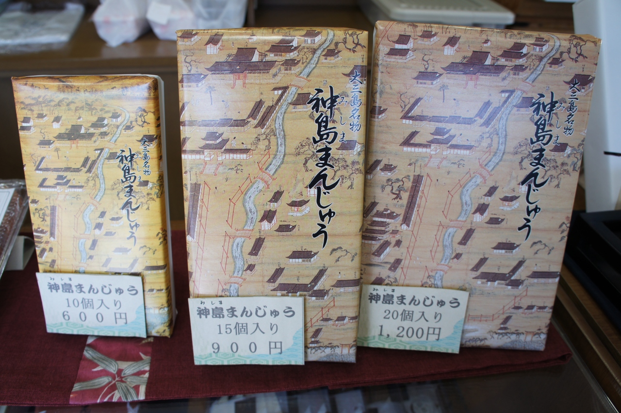 神島(みしま)まんじゅうは、大山祇神社の門前にある和菓子屋さん。おいしいと評判を聞いて訪ねました。写真は贈答用で、私は自宅用で、10個入り550円の簡易パックを購入。もちろん、バラでも1個55円で、売ってくれます。さて、おまんじゅうは、ちょっと小ぶりですね。しかし、しっとりとした生地に白餡の濃厚な甘さが確かにおいしいです。これはいくつでも、いけちゃいますね。コンパクトなどら焼きの感覚でしょうか。その日のうちに食べると、焼きたての感じが残っていて、香ばしいような感じも、とても良かったです。もう少し買うんだったかな・・・