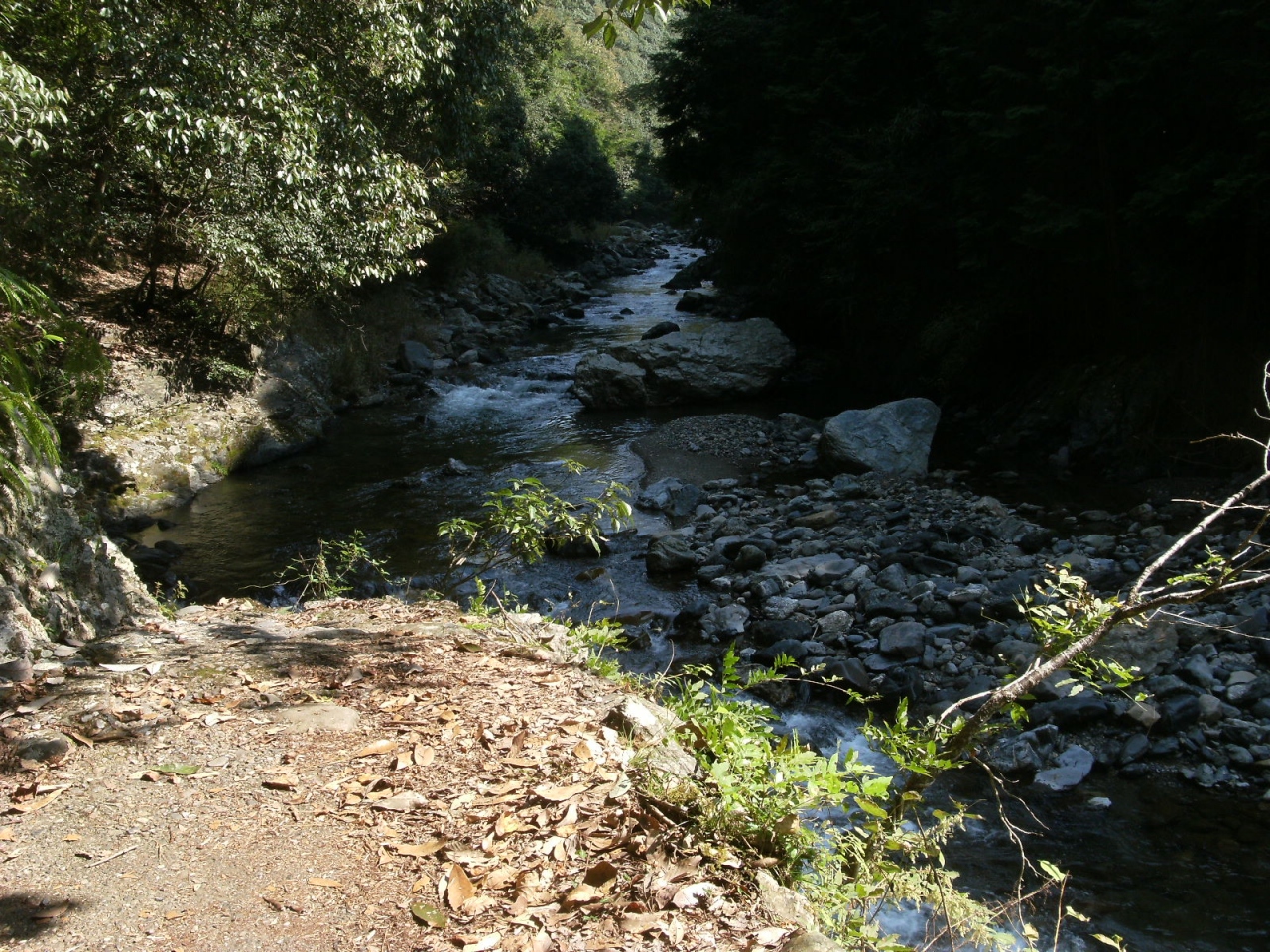 東海自然歩道の標識が目印。ずっと川沿いに遊歩道があるわけではなく、車道を通って迂回する部分もあります。保津峡からの入口は落合橋を渡ったところ。最初は舗装されてますが、そのうち山道のようになります。ここから清滝までは周囲に人家がないため、川にも人工的な護岸などがなく、秘境の雰囲気。清滝から高雄までは一転して人通りが多くなり、道もよく整備されています。神護寺の手前あたりはもみじがたくさんあって、紅葉すれば壮観だろうと思います。