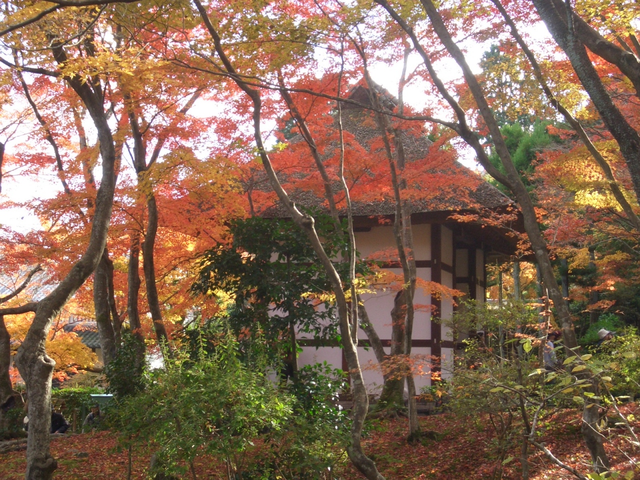 秋も人が少なくなった頃、紅葉も散り始め一面敷き紅葉に彩られたこの寺が好きです。