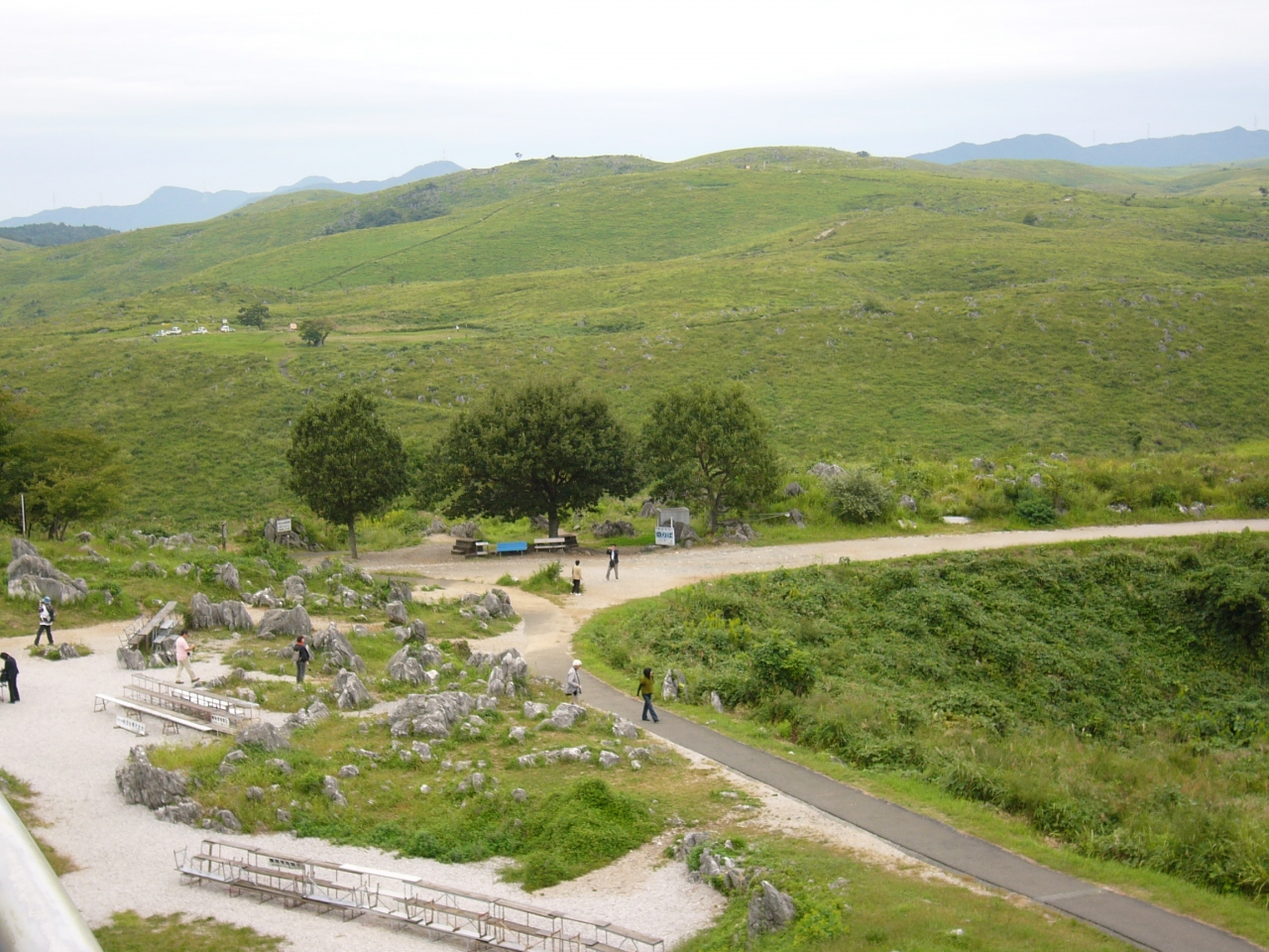 学校で学習した秋吉台カルスト台地のイメージは岩が一面にごつごつ出ている広大なイメージであった。実際に訪れて見ると広大ではあるが表面に露出している岩は思ったよりズーット小さかく牧草が生えている牧場のようなイメージであった。